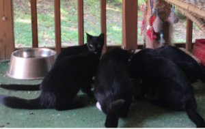 Lisa reached out to Cats R Us (CRU) this summer when the 3 black cats she inherited in a move to Upper Marlboro last year, quickly multiplied to 8 adults and 5 kittens. Additionally 3 neighborhood cats joined the growing colony. CRU provided the much needed funds through our Snyder Grant to spay/neuter and vaccinate the adults. Lisa proved to be quite resourceful and did the legwork of trapping, transporting and recovering her colony. She is thrilled that her colony is stable and eating peacefully on her deck. All the kittens have since found loving homes though Lisa couldn’t resist keeping one little girl for her own.